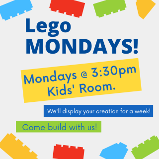 Come build with us! Every Monday afternoon at 3:30 meet your friends at the library to build with Legos. We’ll display your creations for a week in the children’s room.